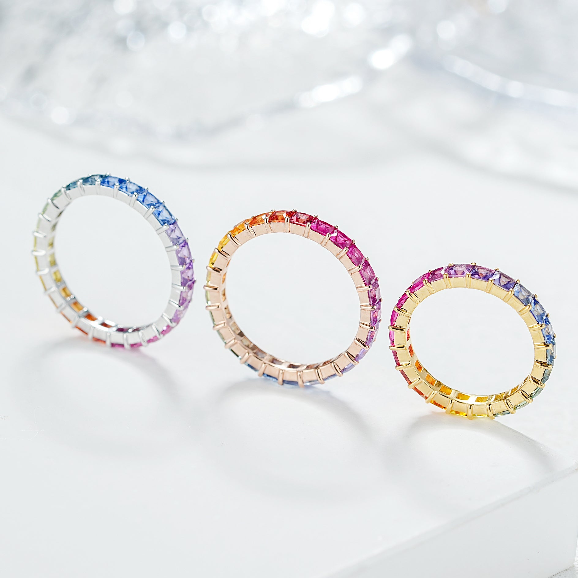 Chroma, a dazzling celebration of color, creativity, and brilliance. Each ring features an array of vibrant, natural multicolored princess sapphires, creating a stunning visual symphony. Expertly crafted to highlight the brilliance and sparkle of every gem, the Chroma series offers a bold and dynamic aesthetic. These rings embody a perfect blend of luxury and artistry. Embrace the spectrum of colors and let your fingers radiate with vibrant elegance.