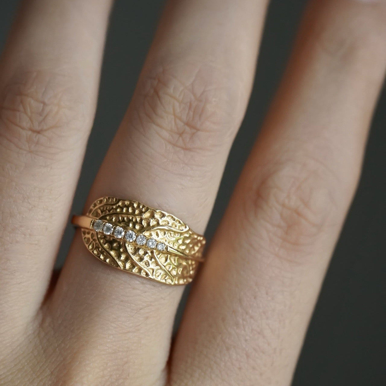 The Verdant Ring captures the essence of flourishing life with its rich texture and organic elegance. Handcrafted in 18K gold, this sculptural piece features intricate leaf-like patterns that evoke nature’s vitality and strength. A delicate row of sparkling brilliant-cut diamonds flows through the center, like morning dew on wild foliage. Bold yet graceful, the Verdant Ring is a celebration of growth, beauty, and resilience. Verdent brings a touch of nature’s brilliance to your everyday — timeless, radiant, and unmistakably unique.